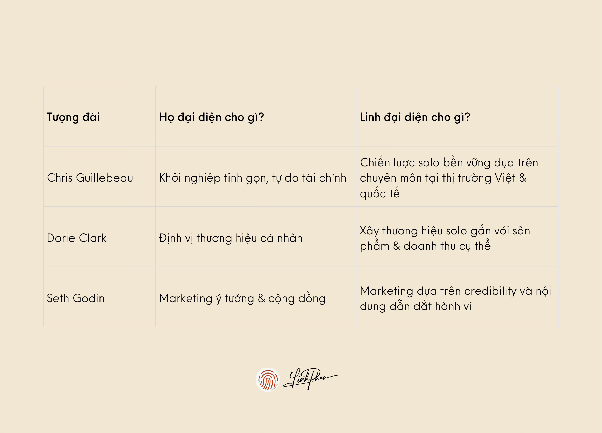 Trong khi các tượng đài này nói về tự do nghề nghiệp, xây thương hiệu hoặc marketing ở quy mô toàn cầu, Linh tập trung vào: