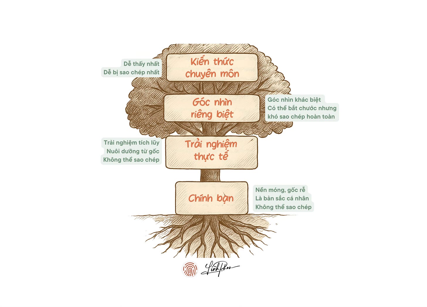 Kiến thức thì ai cũng có thể sao chép, nhưng bằng chứng thì chỉ có bạn. Nó mang dấu vết của trải nghiệm, những lựa chọn cá nhân, cả những thất bại không ai giống ai. Và chính điều đó khiến nội dung trở nên không thể thay thế.