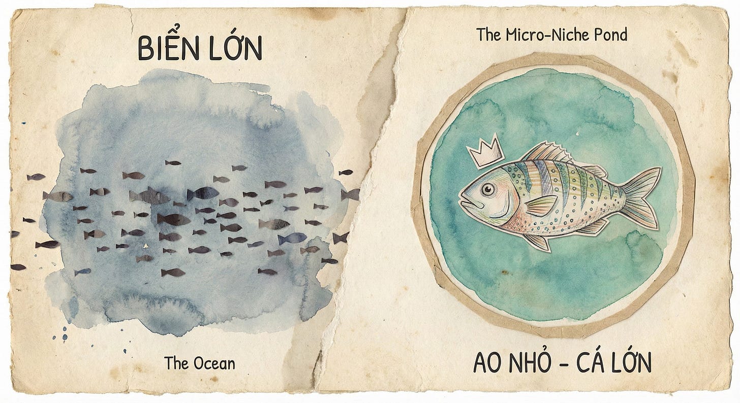 Trong bản tin hôm nay, mình muốn cùng bạn đập tan nỗi sợ “thiếu khách” và hướng dẫn bạn cách tìm ra Micro-Niche (Ngách siêu nhỏ) - chìa khóa để bạn trở thành “cá lớn trong ao nhỏ” thay vì làm một con cá con vô danh ngoài biển lớn.