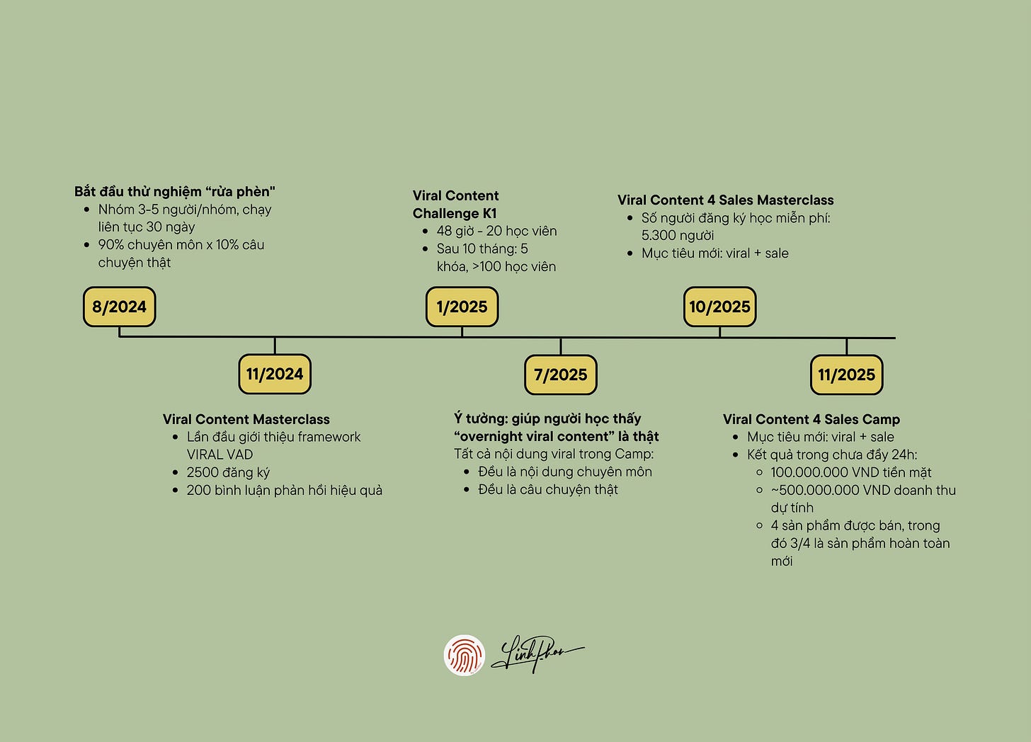 Tháng 1 năm 2025, khi đã “giáo dục” thị trường đủ lâu, tạo nhu cầu và thực sự chứng minh được phương pháp, mình kéo thêm 2 đồng đội là Hiệp Tiên (Content x AI Branding Strategist) và Mina (Personal Branding Strategist) vào cùng chạy thử Viral Content Challenge. Trong 48 giờ đầu tiên, gần 20 người đăng ký. Đến khóa 5 đã có hơn 100 người tham gia, cứ mở lớp là có học viên đăng ký. Viral bắt đầu trở thành chuyện “muốn thì làm được”, không còn là cảm giác “trông chờ”.