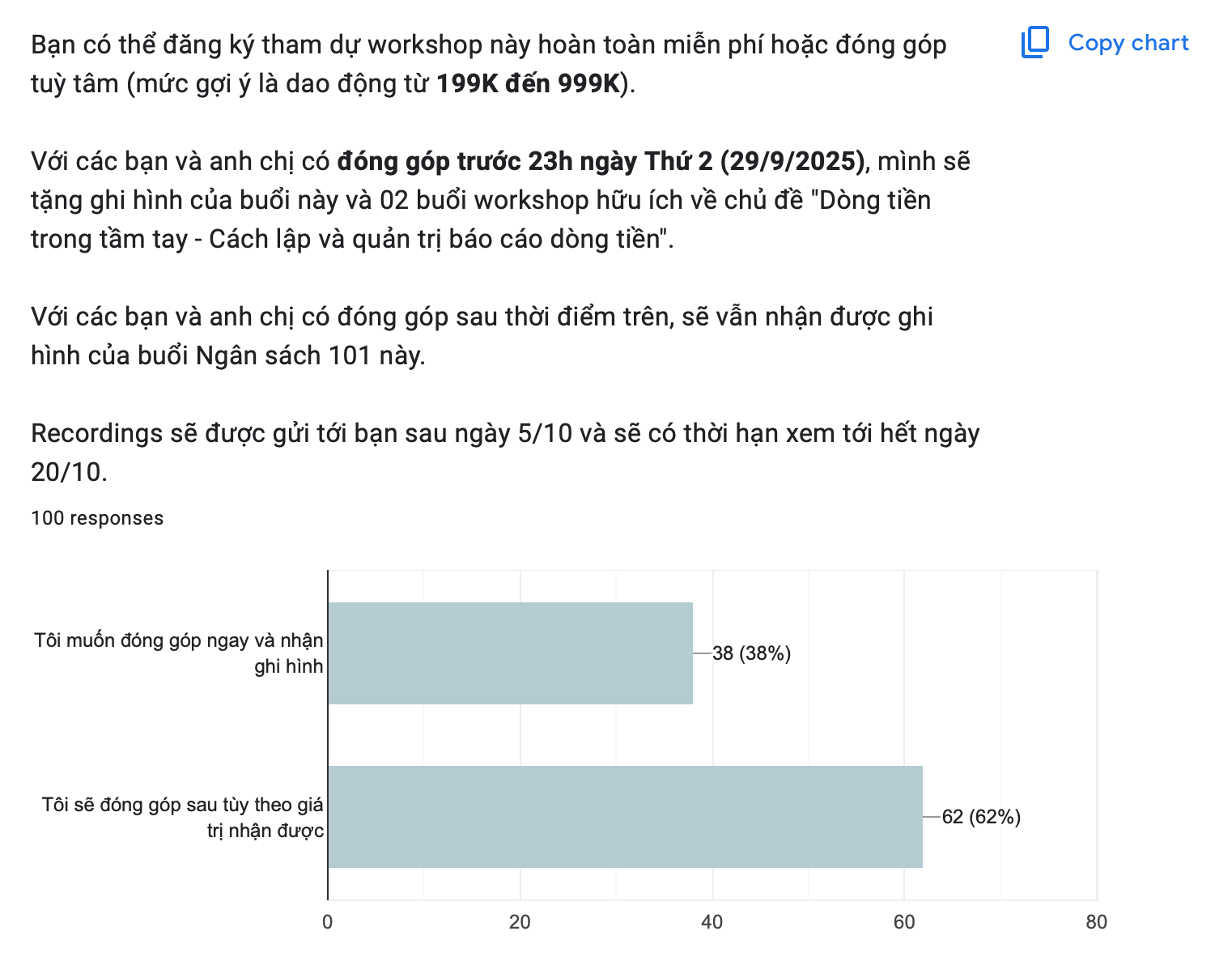 Đó là lúc cơ chế “donate tự nguyện” (hay hình thức Pay what you want) bước vào như một giải pháp trung gian. Nó vừa cho phép mở cửa phễu tiếp cận, vừa tạo cơ hội đo lường mức độ sẵn lòng chi trả của khán giả, lại vừa giữ cho mối quan hệ giữa chuyên gia và người học bắt đầu từ niềm tin chứ không phải từ sự nghi ngại. Điều thú vị là, donate tự nguyện không chỉ mang lại nguồn thu ngắn hạn mà còn trở thành một thước đo chính xác về độ “nhiệt” của thị trường.