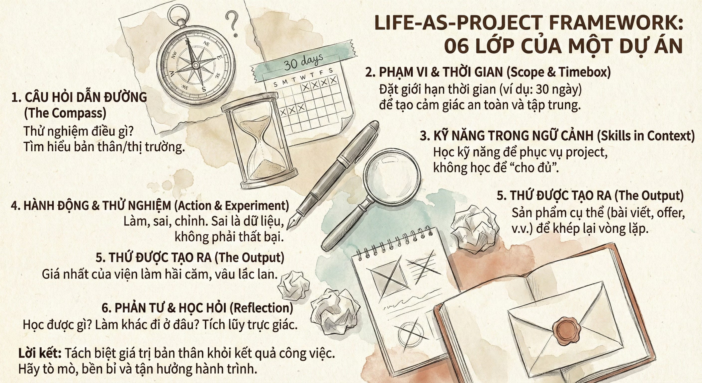 Từ quan sát đó, mình bắt đầu nhìn mọi thứ qua một lăng kính đơn giản hơn. Mình gọi nó là Life-as-Project Framework.