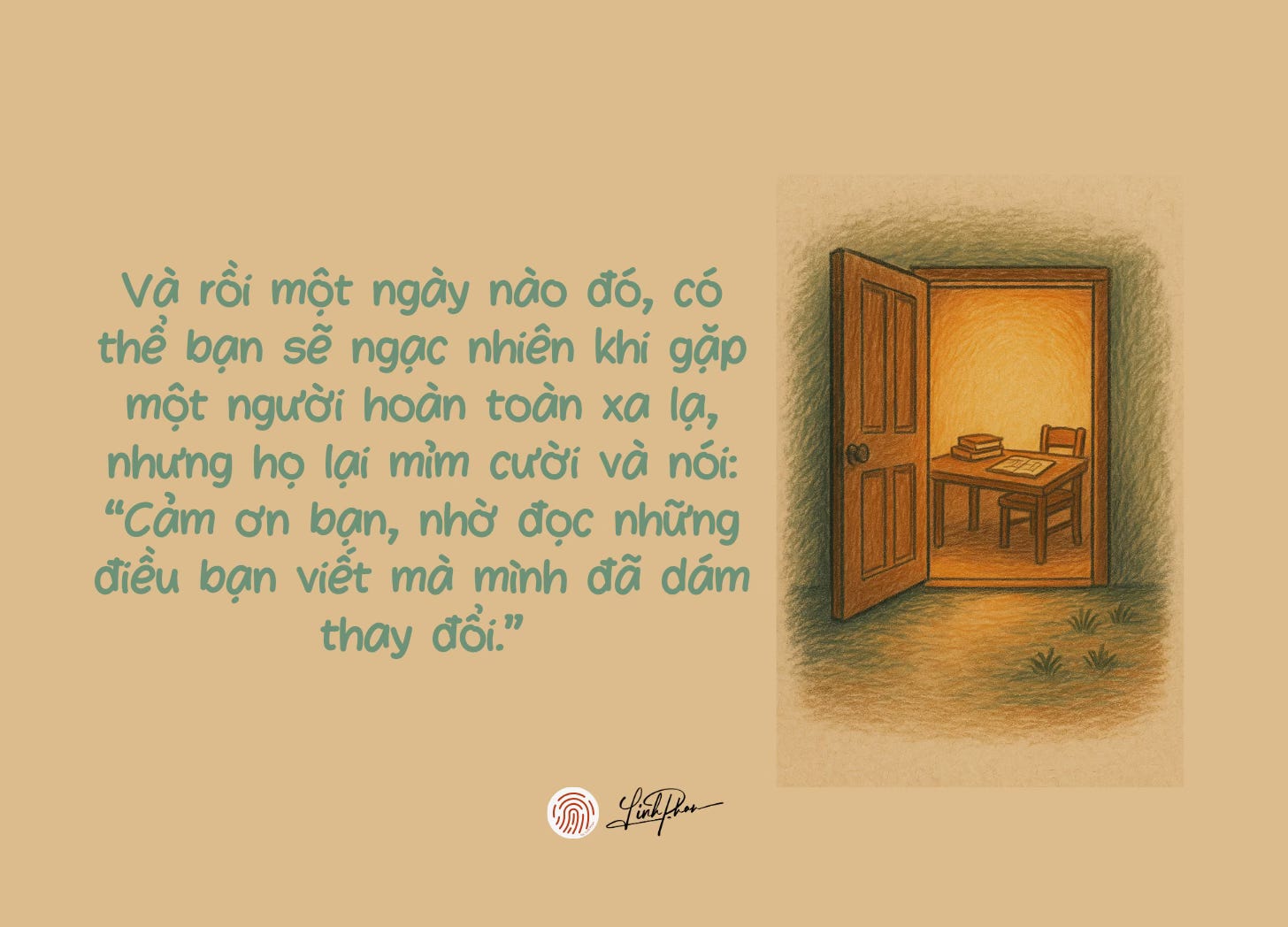 Và rồi một ngày nào đó, có thể bạn sẽ ngạc nhiên khi gặp một người hoàn toàn xa lạ, nhưng họ lại mỉm cười và nói: “Cảm ơn bạn, nhờ đọc những điều bạn viết mà mình đã dám thay đổi.”